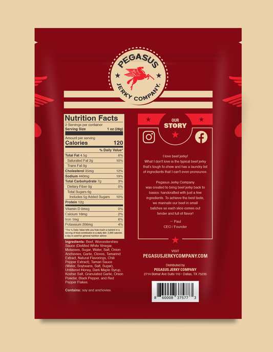 We love beef jerky! What we don't love is tough, chewy jerky with a laundry list of ingredients that nobody can pronounce. Pegasus Jerky Company was founded to bring beef jerky back to basics: small-batch, handcrafted, and made with just a few simple ingredients.